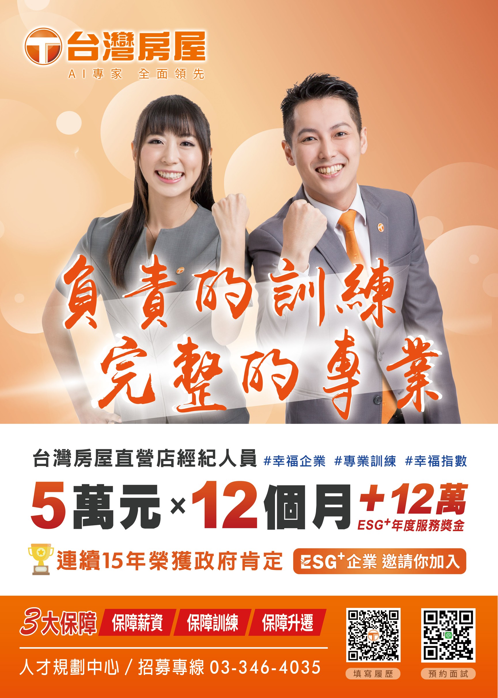 台灣房屋秉持「高品質服務房仲」的理念,追求提供專業服務與交易安全。擁有全台獨家的「智慧型訓練中心」,期許經紀人員以「知識仲介」創造客戶最大價值。並因應氣候暖化、人口老化未來「雙化」問題,10年前即落實ESG+社會責任,植樹減碳已達三萬五千棵,並打造健康智慧園區,成為台灣房仲業首家實現跨領域、全流程服務的標竿企業。 推動ESG+主理人計畫,透過「+」的積極作為,視為吹響行動的號角,為客戶、為產業、為環保盡一份心力,也是我們永續服務發展的承諾。我們的團隊以「很高興和您成為一家人」為初衷,實踐「永遠照顧台灣一家人」的行動,永續服務每一位客戶。
